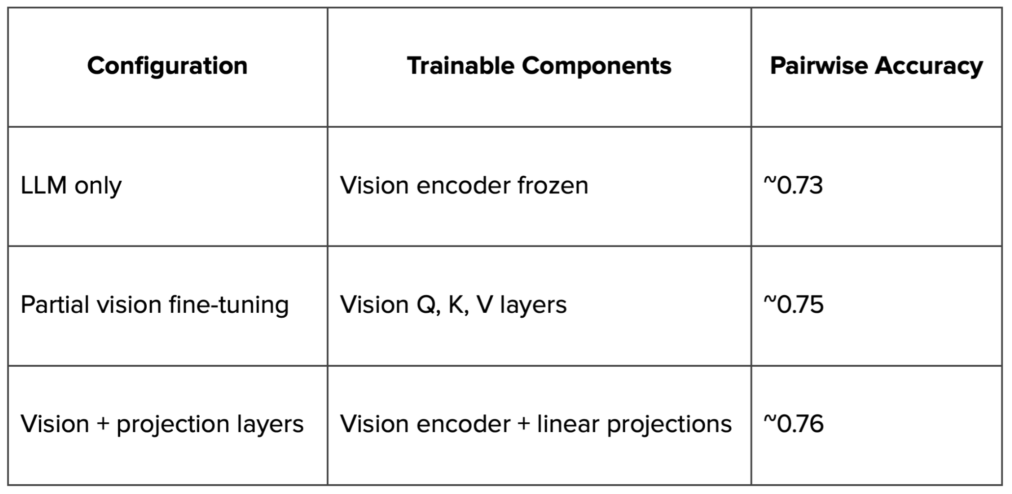 We observed that training the vision encoder led to the most significant performance gains.